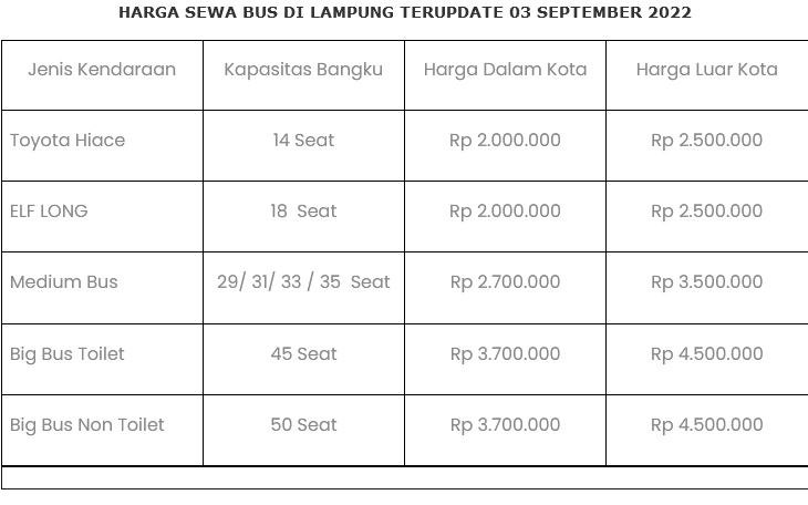 Biaya sewa bus Jakarta Lampung sudah termasuk untuk jasa driver , crew dan BBM termasuk TOL dan Penyebrangan Kapal Ferry Apabila tujuan ke pulau jawa. Adapun biaya retribusi, parker, tol, tiket masuk tempat wisata, dan konsumsi driver serta penginapan untuk tujuan luar kota ditanggung oleh penyewa.